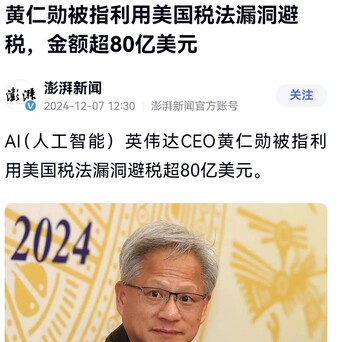 现在英伟达已经面临着美国商务部反垄断调查,美国媒体又爆出黄仁勋避税80亿美元,美国国家税务局,那是一个强势机构,连自己的军队都有,避税80亿美元,还是一个和美国没有根基的华裔,没有家族势力,没有政治背景,突然赚了大钱。这不就是养肥的猪,正好去宰杀吗?