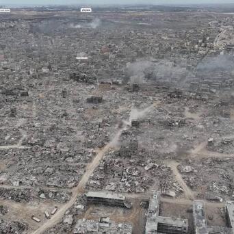 配资带你炒股 12月15日,巴勒斯坦抵抗武装无人机航拍下的,加沙市北部的贾巴利亚难